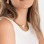 Rose en un collar que combina el brillo de la perla de dulce con una cadena ligeramente gruesa elaborada en acero inoxidable y bañada en oro de 18k, con este collar realzaras tu cuello, lucirás muy atractiva y te robaras todas las miradas.